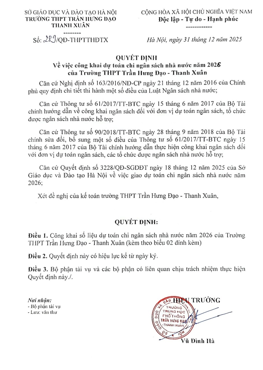 QUYẾT ĐỊNH: Về việc công khai dự toán thu chi ngân sách Quư I năm 2024 của Trường THPT Trần Hưng Đạo - Thanh Xuân
